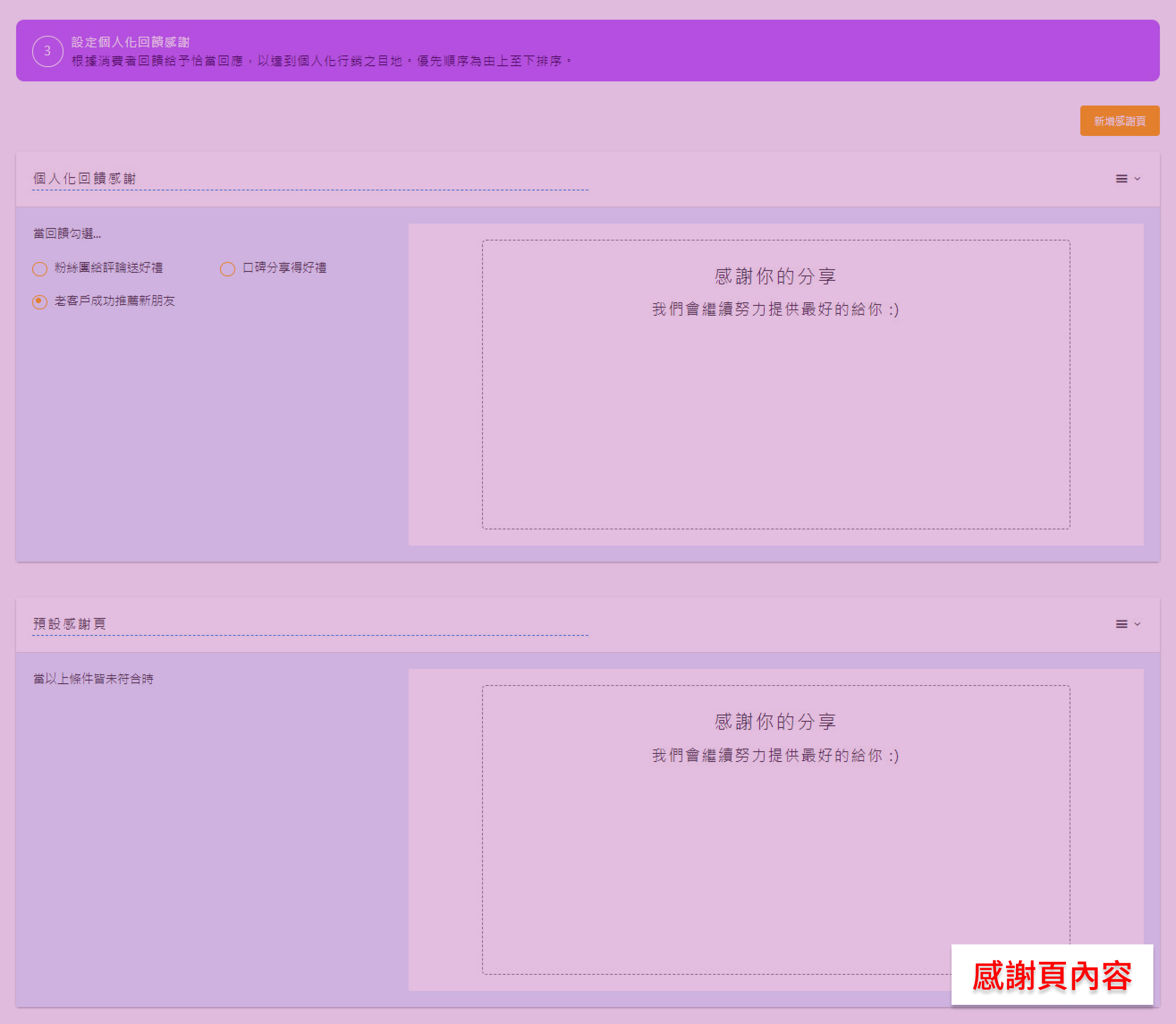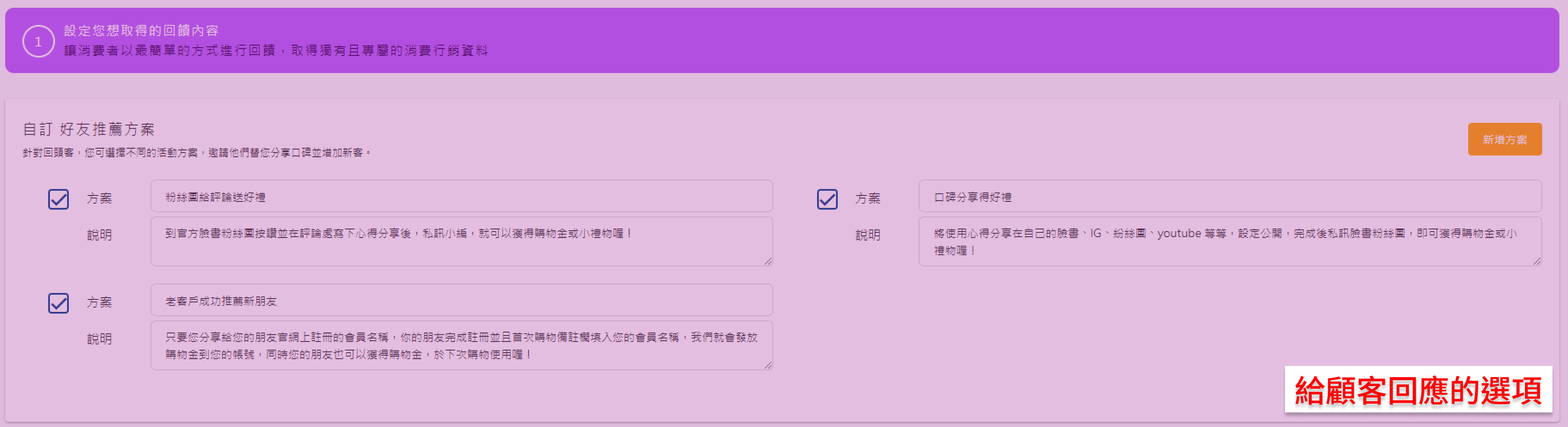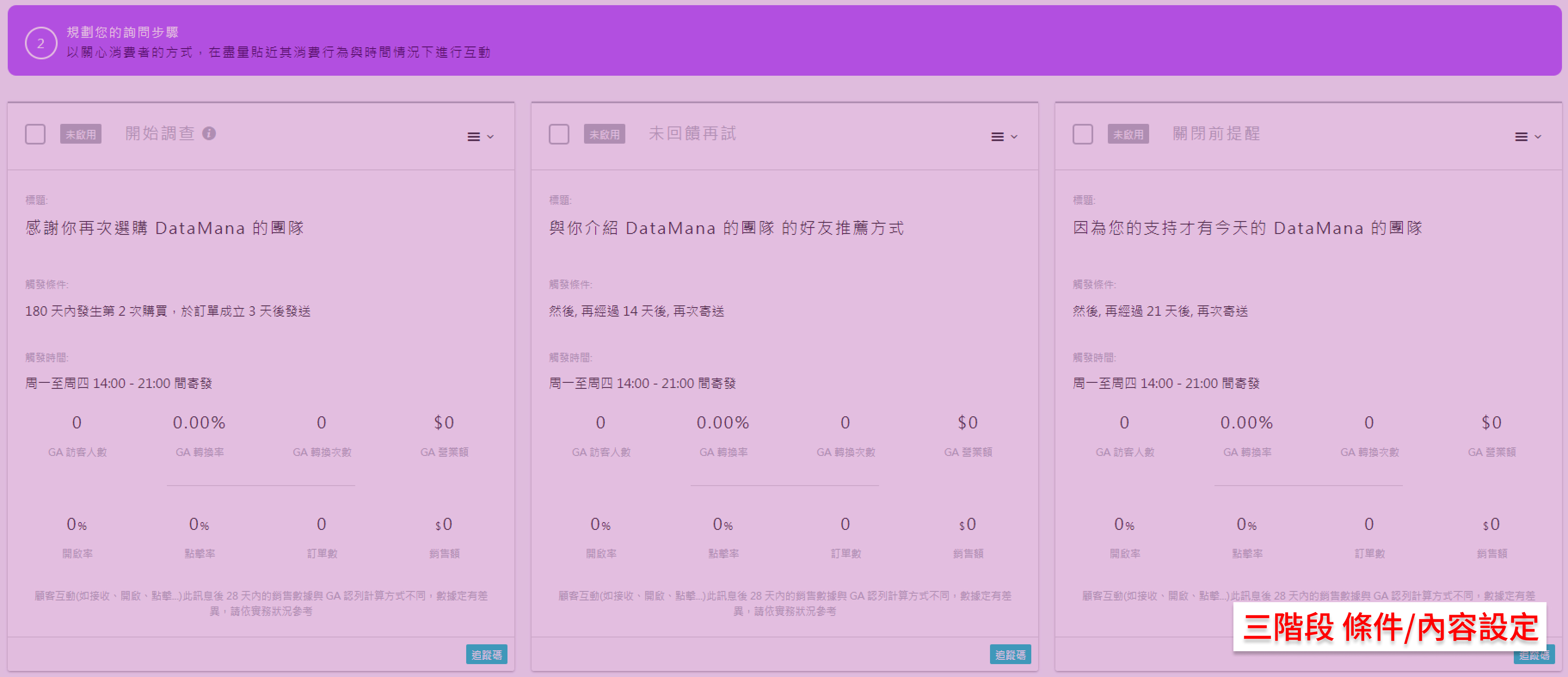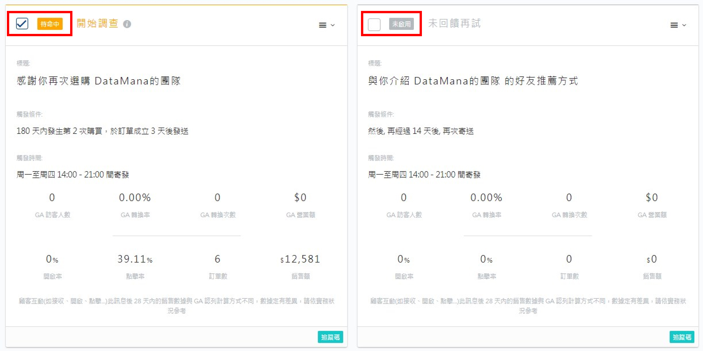 好友推薦 發送回購感謝信件給已購買過的客戶,快速、省時佈署回購客推薦機制!將回購客轉化為推薦者,是品牌招募新客非常有效率的管道之一。 功能架構與頁面簡述 啟用模組 當問卷內容編輯完成並確認要開啟的階段數量後,點選該階段左上角的小方框,立即會從「未啟用」切換為「待命中」。信件將會於系統運作時間,依照設定之條件進行自動發送。 經營成效追蹤 請至智能經營成效瀏覽操作手冊。 顧客回饋請參閱操作手冊 智能經營成效中的好友推薦調查回饋。